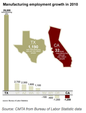 “Looks like Texas grabbed new high-wage manufacturing jobs at a clip of 1,100 per 1 million of its citizens while California lost approximately 32 jobs per 1 million of its own hard workers. Ouch,” said association spokesman Gino DiCaro.