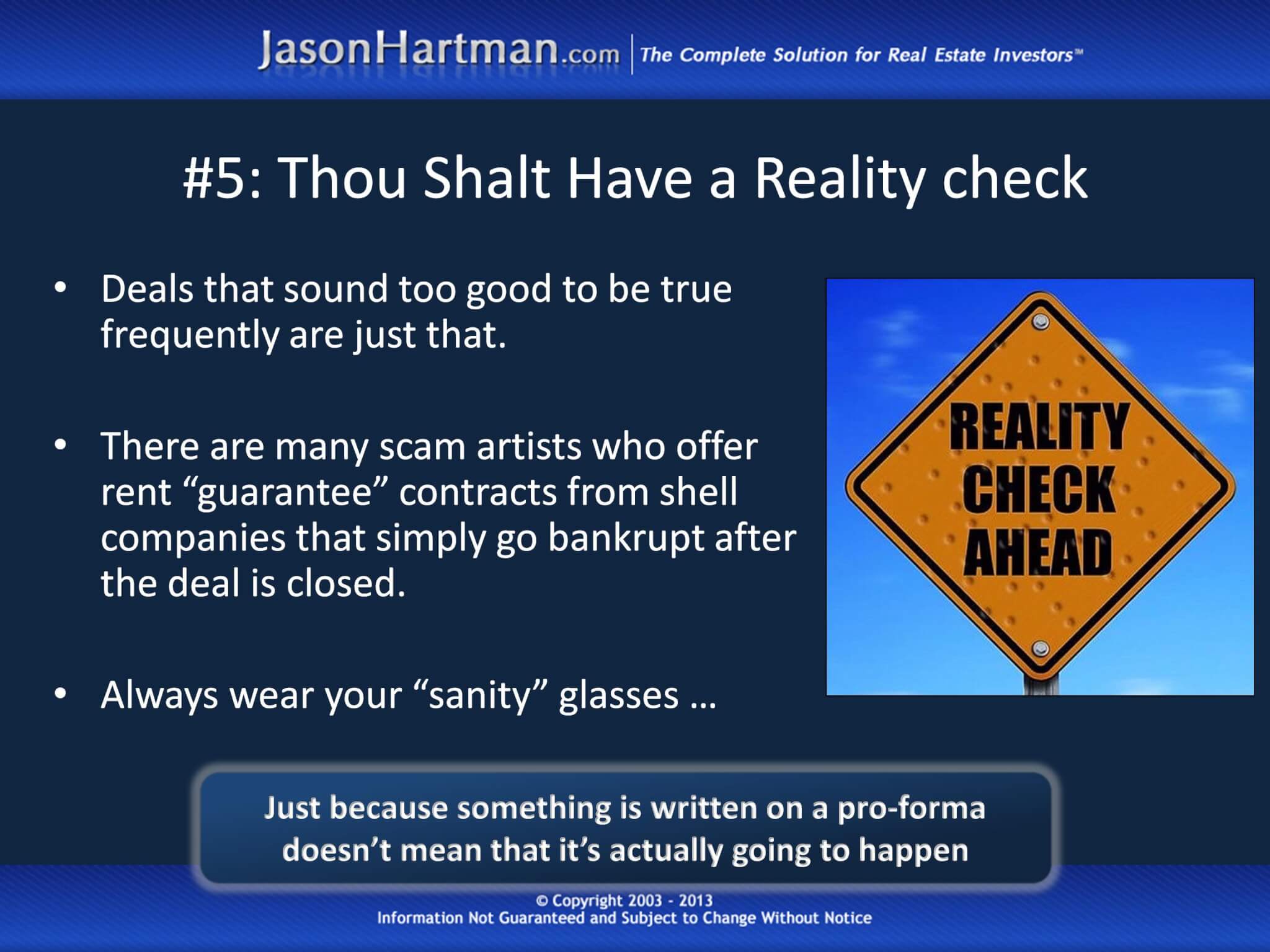 Because of this, it is important for investors to have a reality check. When a deal sounds too good to be true, it usually is. Astute investors must understand that contracts and pro-forma projections can be used to hide real problems from investors who have been blinded by their desire for big returns.
