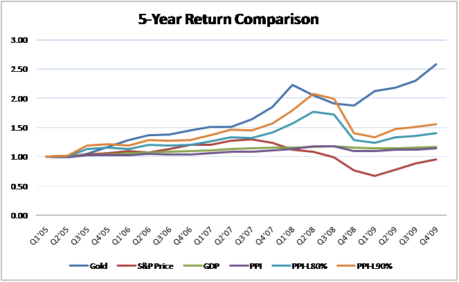Decade-1Charting out the price of gold, the S&P 500 stock index, US GDP, the Producer Price Index for all commodities, and an 80% / 90% leveraged PPI for five years seems to validate these points.  The price of gold is frequently seen as an indicator of future inflation expectations, and has rocketed upward since the financial collapse of 2008.  The ‘all commodities’ Producer Price Index registered a decline after the same financial collapse, due to the deleveraging of commodity portfolios by hedge funds.  When this is leveraged, it extends out to compress returns such that gold vastly outperforms all of the other major indicators.
